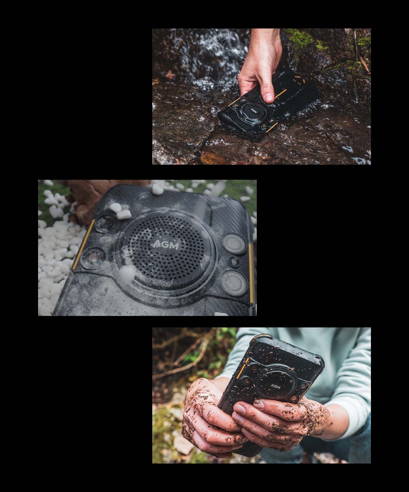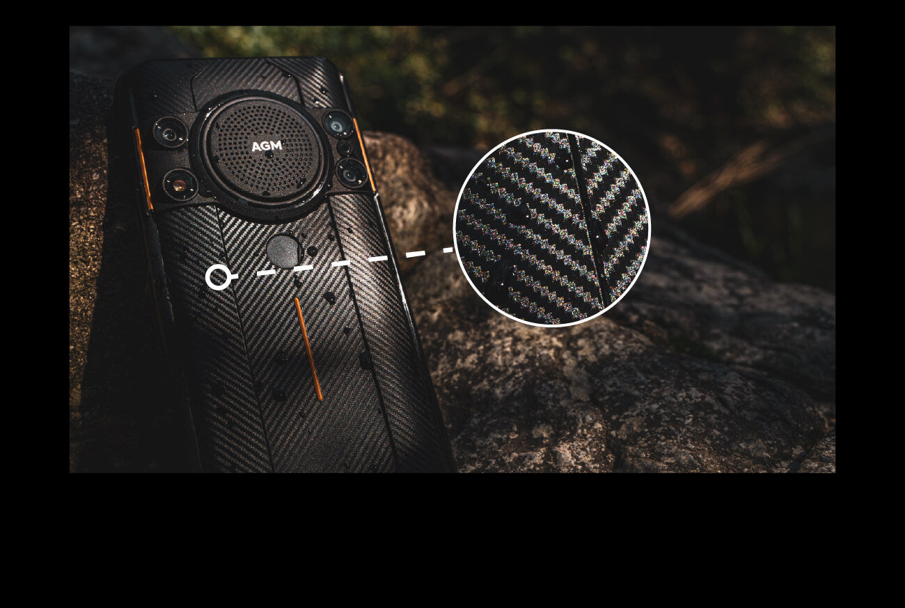 Задняя панель AGM H5 изготавливается как карбоновое волокно*, используемое в аэрокосмической отрасли и военной технике. Обеспечивает гладкую поверхность, устойчивую к царапинам.