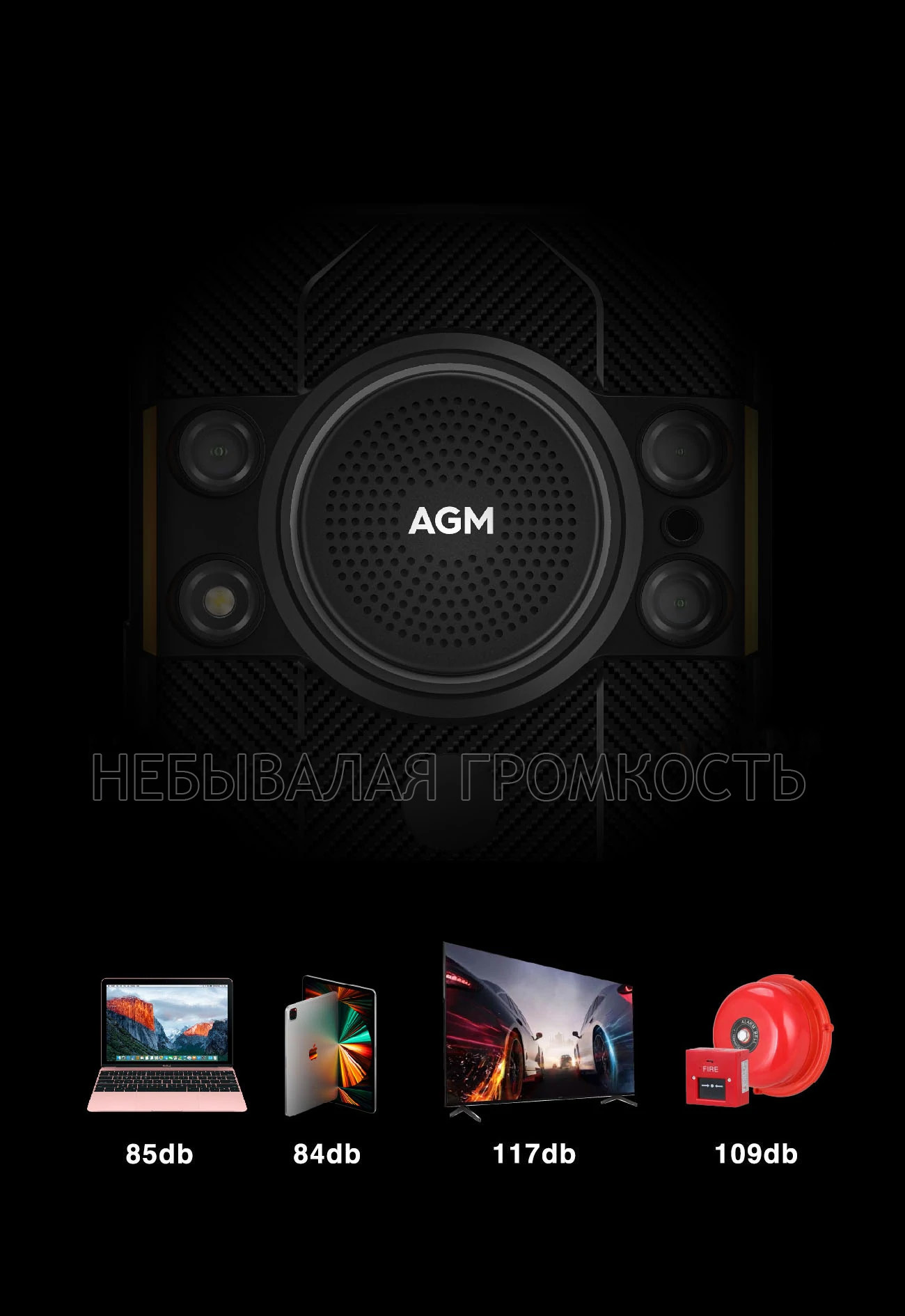 Новый смартфон AGM H5 повысил лимиты громкости благодаря самому громкому динамику среди смартфонов. Готовы к новому уровню звучания? Огромный динамик, диаметром 33мм обеспечивает громкость до 109дБ. Звук проникает сквозь стены и большие пространства. Телефоны никогда не были настолько громкими.