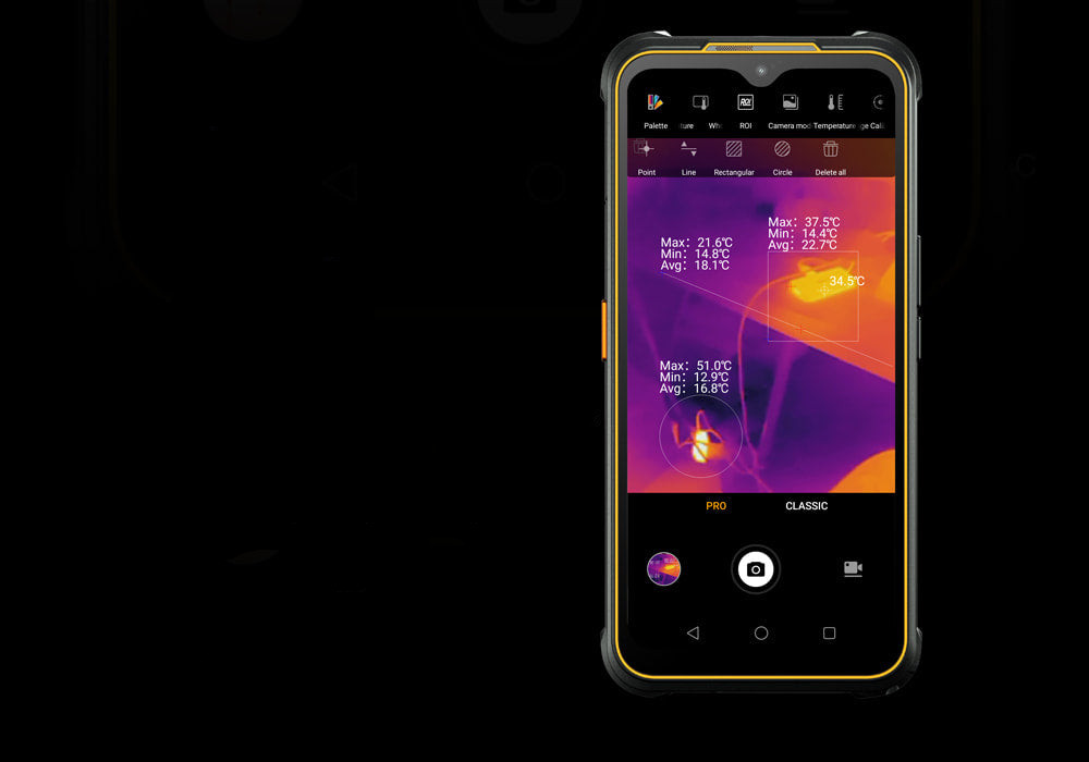 Для измерения температуры в определённой зоне, AGM Glory G1S отмечает специальными метками: точки, линии, прямоугольники и окружности.